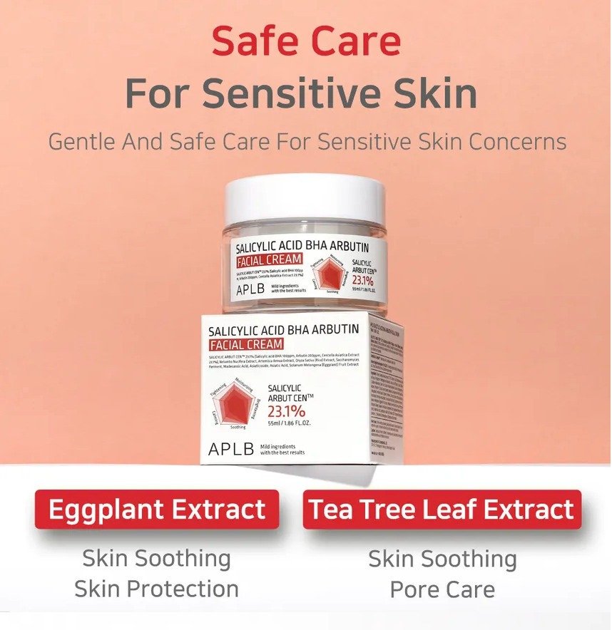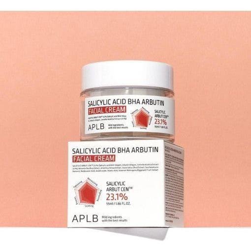 Η APLB Salicylic Acid BHA Arbutin Facial Cream 55ml είναι μια ολοκληρωμένη ενυδατική κρέμα προσώπου με πολλαπλή δράση — ιδανική για λιπαρό, μεικτό ή ακνεικό δέρμα, αλλά και για όσους επιδιώκουν ομοιόμορφο τόνο και λαμπερή επιδερμίδα.