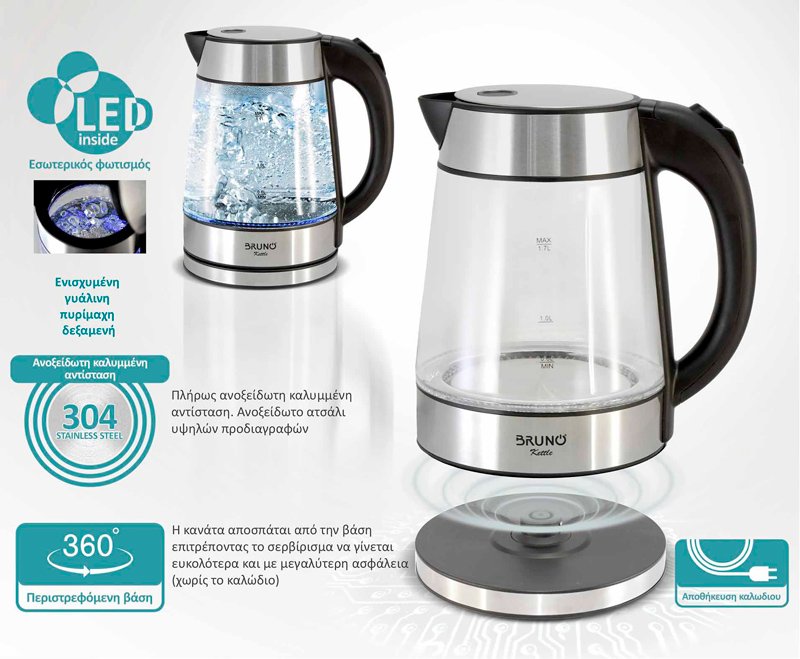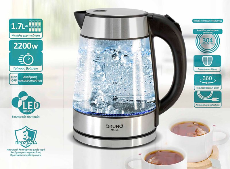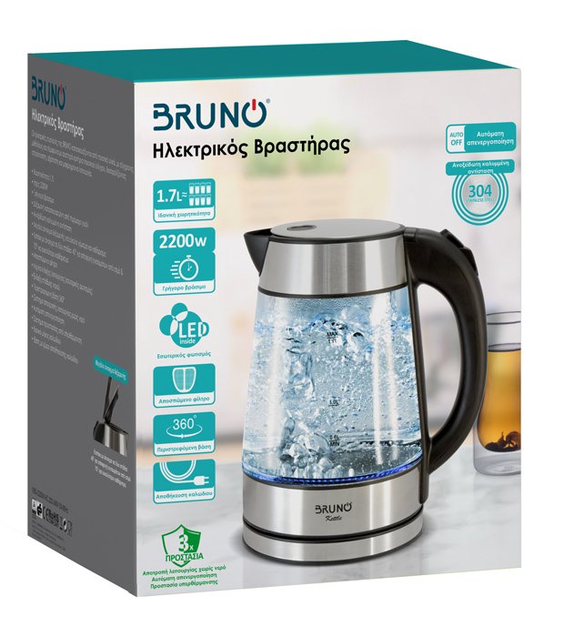 BRUNO βραστήρας νερού BRN-0143, 1.7L, 2200W, γυάλινος-Inox