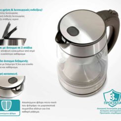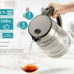 Με ιδανική χωρητικότητα 1,7 λίτρων που καλύπτει κάθε ανάγκη σε ποσότητα νερού και μεγάλη ισχύ 2200W που δίνει την δυνατότητα γρήγορου βρασμό μέσα σε λίγα λεπτά.