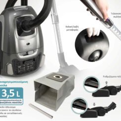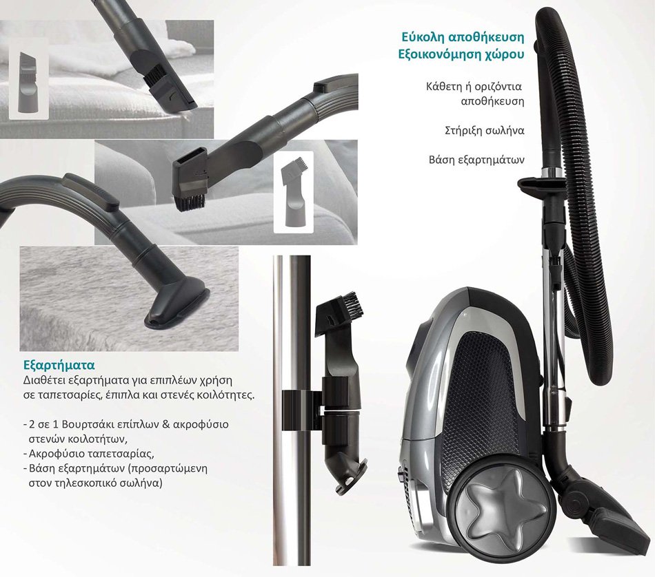 Είναι ιδανική για καθάρισμα όλων των τύπων δαπέδων και χαλιών και διαθέτει εξαρτήματα για επιπλέων χρήση σε ταπετσαρίες, έπιπλα και στενές κοιλότητες.