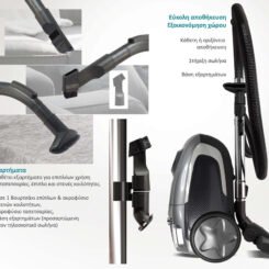 Συναρμολογείται γρήγορα. Ενεργοποιείτε, απενεργοποιείτε και ρυθμίζετε εύκολα την ισχύ-ταχύτητα στο επίπεδο που επιθυμείτε ανάλογα με την επιφάνεια που καθαρίζετε. Με την ένδειξη πλήρωσης σακούλας γνωρίζετε άμεσα πότε πρέπει να αδειάσετε την σακούλα. Αδειάζετε ή αντικαθιστάτε την σακούλα πολύ εύκολα όποτε χρειαστεί. Με το ελαφρύ βάρος, τον εργονομικό σχεδιασμό στους τροχούς και το λειτουργικό πέλμα, σκουπίζετε και μεταφέρεστε στον χώρο άνετα χωρίς κούραση. Διαθέτει αυτόματη επαναφορά καλωδίου.