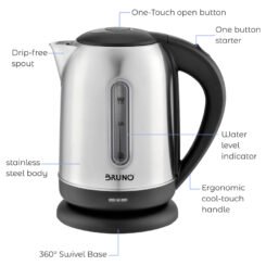 Ηλεκτρικός βραστήρας εξαιρετικής απόδοσης της BRUNO με ισχύ 2200W και χωρητικότητα 1,7 lt. Εξοπλίζεται με περιστρεφόμενη βάση 360° και εργονομική λαβή για εύκολο κράτημα. Επιπλέον διαθέτει σύστημα ασφαλείας κατά του βρασμού χωρίς νερό και σύστημα αυτόματης διακοπής βρασμού.