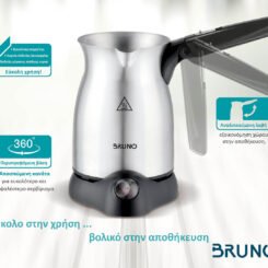 Το ηλεκτρικό μπρίκι BRUNO BRN-0041 είναι ιδανικό για εύκολη και γρήγορη ετοιμασία του αγαπημένου σας Ελληνικού καφέ καθώς και για το ζέσταμα νερού για άλλα ζεστά ροφήματα, έτοιμες σούπες, κρέμες κτλ.