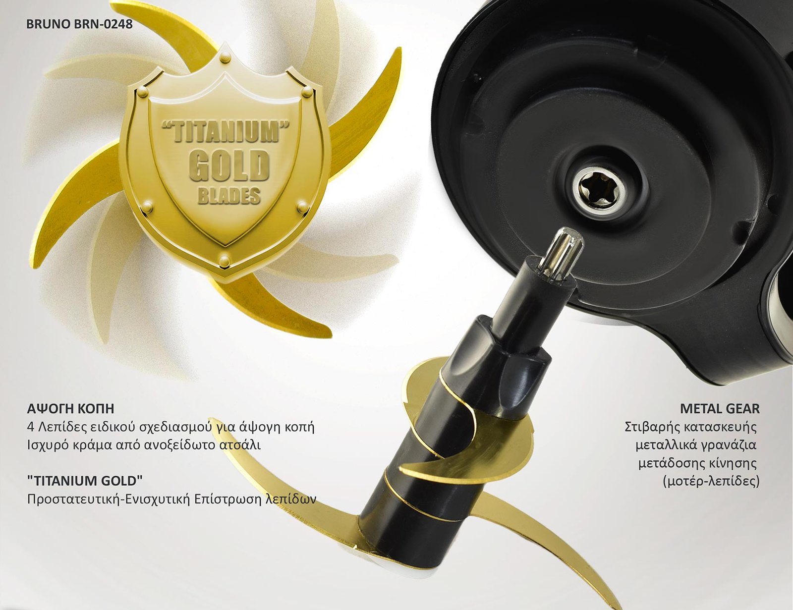 Χαρακτηριστικά του η άψογη κοπή και η γρήγορη-άνετη χρήση, χάρις στις 4 μεγάλες λεπίδες ειδικού σχεδιασμού "TITANIUM GOLD", στο πανίσχυρο τύπο μοτέρ 500W καθώς και την στιβαρή κατασκευή μηχανικών τμημάτων με μεταλλικά γρανάζια μετάδοσης κίνησης.