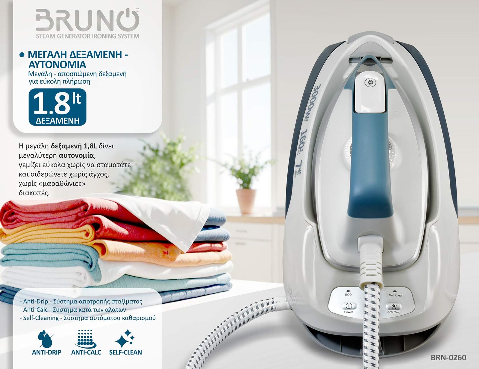 BRUNO σύστημα σιδερώματος BRN-0260, πίεσης 7bar, με δοχείο 1.8L, 3000W