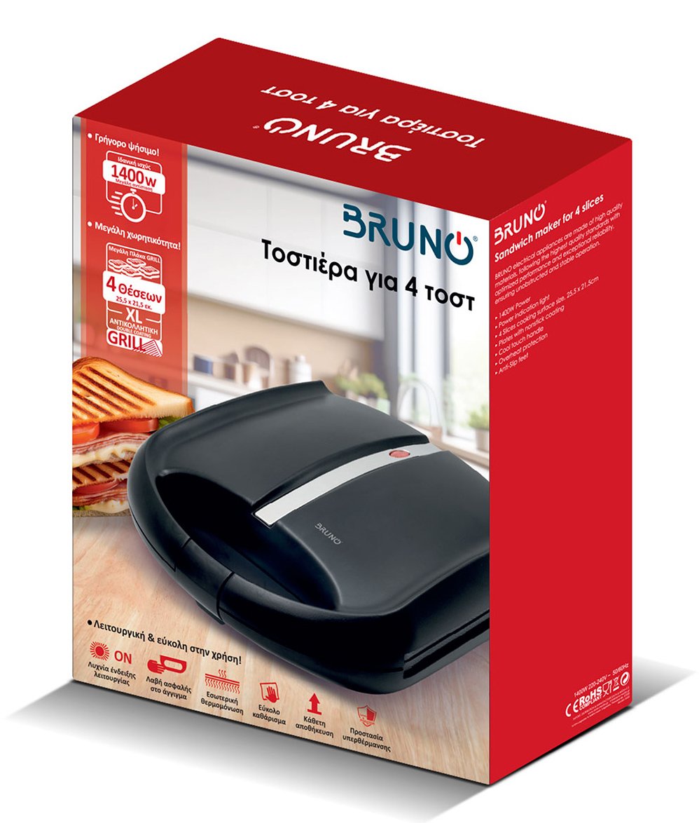 Η Ψηστιέρα-Τοστιέρα για 4 τοστ BRUNO BRN-0216 είναι ιδανική για ψήσιμο τοστ, σπιτικών σάντουιτς και άλλων snack σε σύντομο χρόνο.