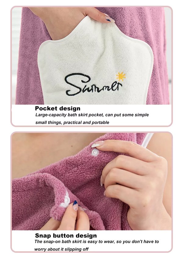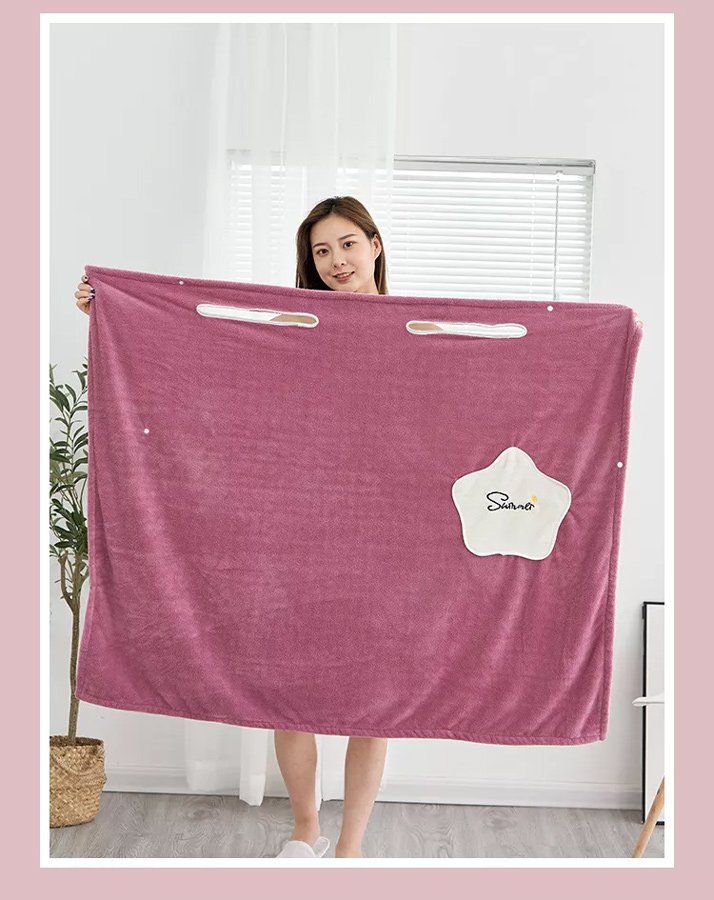 Γυναικεία πετσέτα σώματος κατασκευασμένη από εξαιρετικά υδροαπορροφητικό υλικό και με απαλή ύφη. Διαθέτει έξυπνο σχεδιασμό με οπές μέσω των οποίων μπορούν να περάσουν τα χεριά και κουμπώματα για να μπορεί να φορεθεί σαν μπουρνούζι.
