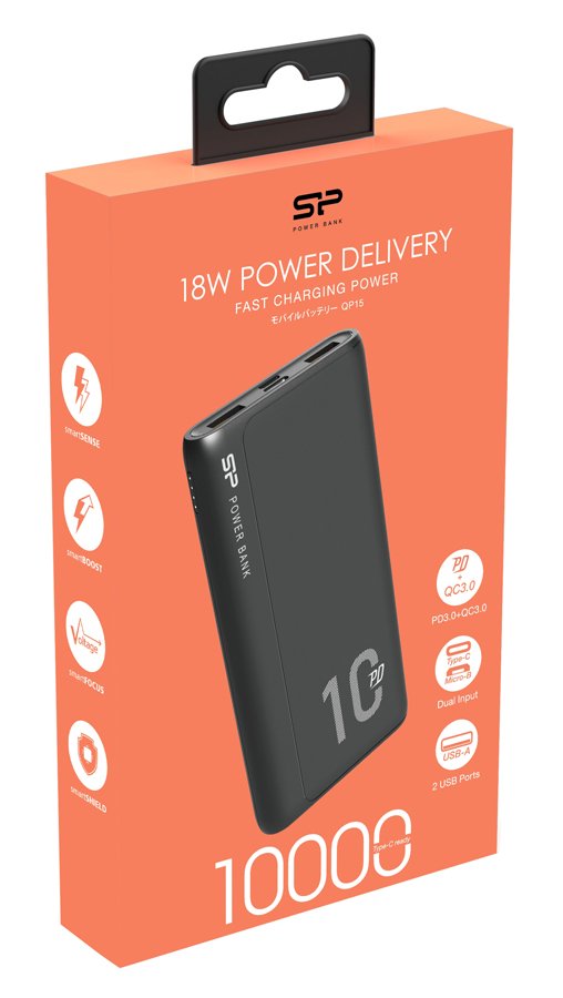 Με το power bank QP15 της Silicon Power το άγχος της εξαντλημένης μπαταρίας θα είναι παρελθόν. Η μπαταρία μεγάλης χωρητικότητας 10.000mAh, είναι σε θέση να φορτίσει το smartphone σας ή όποια άλλη συμβατή συσκευή, 2-4 φορές με μια μόνο φόρτιση. Διαθέτει 2 θύρες εξόδου USB και 1 θύρα εξόδου/εισόδου USB Type-C (PD) με συνολική απόδοση έως 3A. Επιπλέον, εξοπλίζεται με 4 LEDS indicators για την ένδειξη της μπαταρίας και φορτίζει μέσω θύρας USB Type-C ή Micro USB.