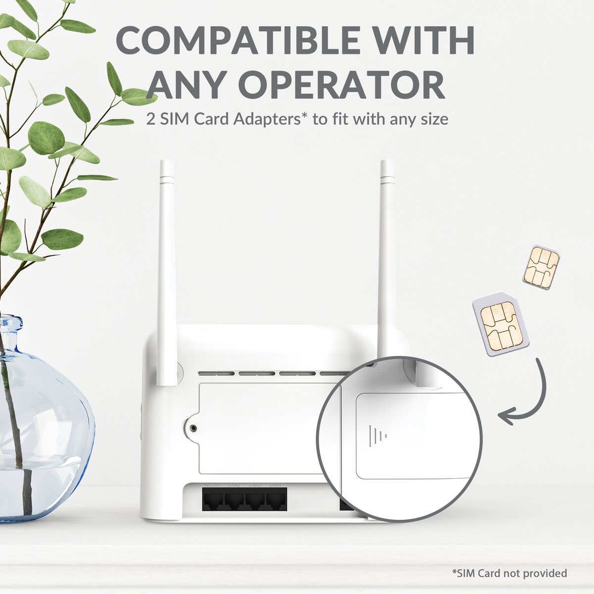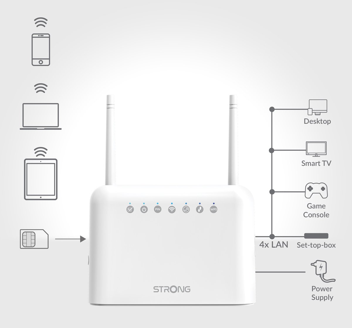 Το router της STRONG σας επιτρέπει να μοιράζεστε μέσω κάρτας SIM, ασύρματο δίκτυο κινητής τηλεφωνίας 4G, με ταχύτητα έως 150 Mbps.