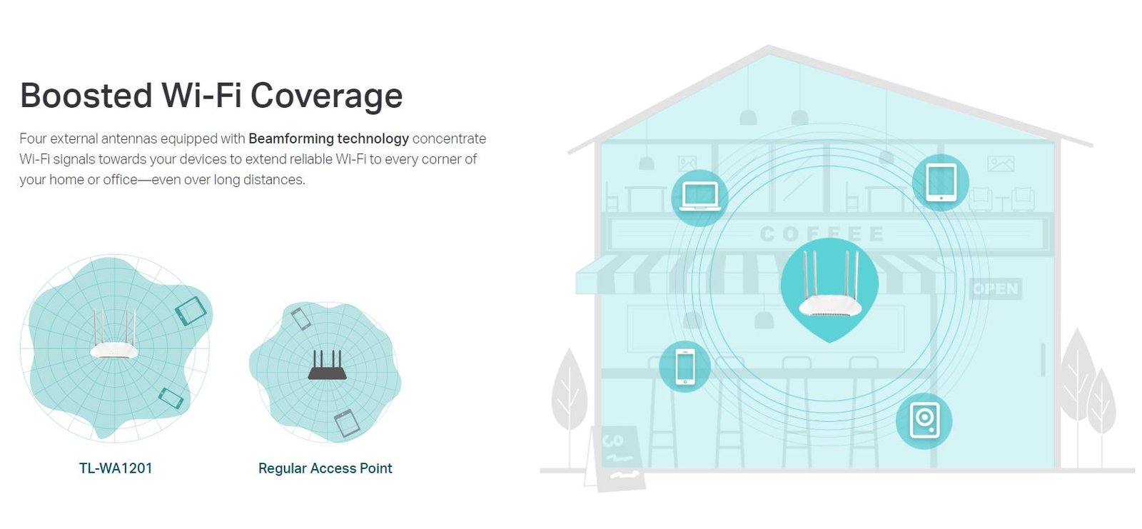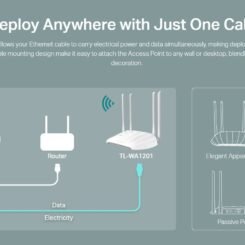 Το TL-WA1201 είναι ένα πολυχρηστικό access point κατάλληλο για την δικτύωση σπιτιών και μικρών επιχειρήσεων. Με πολλαπλές κεραίες και Dual Band Wi-Fi παρέχει εξαιρετικές ταχύτητες και δυνατό σήμα ακόμη και σε δυσπρόσιτα σημεία του χώρου. Υποστηρίζει συχνότητες 5GHZ και 2.4GHZ με ταχύτητες μέχρι και 867 Mbps και 300 Mbps αντίστοιχα. Η τεχνολογία MU-MIMO δίνει την δυνατότητα στο access point να διαμοιράζει το σήμα ταυτόχρονα σε πολλές συσκευές χωρίς καθυστερήσεις ενώ η θύρα Gigabit επιτρέπει σε διασύνδεση με υψηλές ταχύτητες. Το access point μπορεί να λειτουργήσει και με πολλαπλές επιπλέον λειτουργίες όπως range entender mode, client mode και Multi-SSID mode. Υποστηριζεται η τεχνολογία PoE η οποία μπορεί να τροφοδοτήσει το access point με το απαραίτητο ρεύμα μέσω του ethernet καλωδίου σύνδεσης, περιορίζοντας έτσι τα καλώδια κατά την τοποθέτηση. Το λογισμικό Captive Portal Marketing επιτρέπει στον ειδικό σχεδιασμό σελίδας για την είσοδο των "guests" στο δίκτυο της επιχείρησης, παρέχοντας την δυνατότητα για διαφήμιση ή ενημέρωση τους μέσω αυτού. Η τεχνολογία Beamforming εξασφαλίζει ότι θα δίνετε δυνατό σήμα ακριβώς στην περιοχή που χρειάζεται περισσότερο κατά μήκος του χώρου.